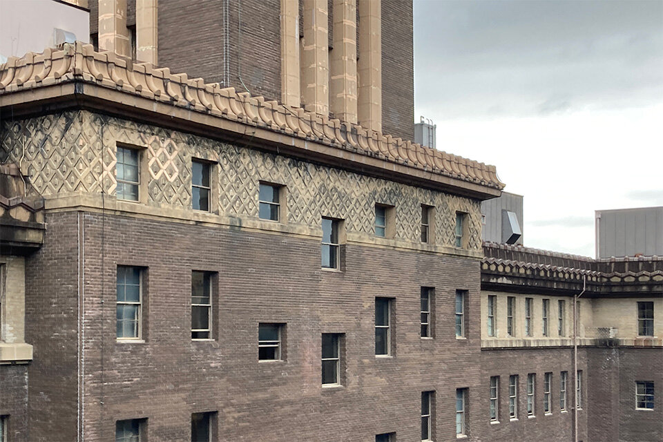 近くの名古屋市役所は、空襲から難を逃れました。建物が頑丈だったということもありますが、空から見えなくするために「壁を黒く塗って」見えにくくしていたそうなんです。表からは見えないんですが、市庁舎を入った裏側にその痕跡が残っています。
