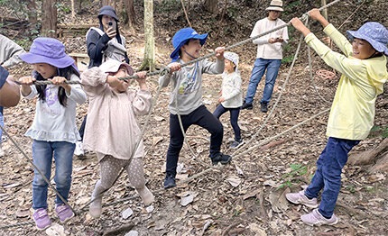 チームばんどりは万博終了後も、そのメインテーマだった「自然の叡智」を継承していく役割を今も担っています。さまざまな自然の中で思いっきり遊びながら、多様な生き物がいることを知ったり、触れたりすることで、自然と生きるパワーにつながっていると感じています。中でも「森のようちえん・むささびっ子の森くらぶ」は、年少から年長にあたる年齢の子とその保護者を対象に、森や川などさまざまな自然の中で思いっきり遊ぶことをメインにしています。