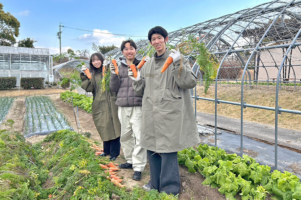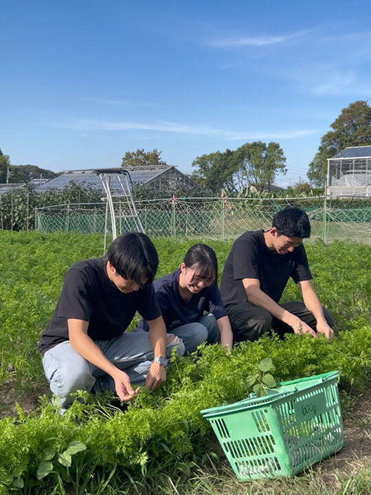 南山大学経営学部の川北ゼミのメンバーで、農業や食に関心のある岡 賢明さん、倉田 良矢さん、須崎 沙耶さんの3人が「未来耕し隊」を結成し、2025年4月から活動しています。伝統野菜の普及に取り組んでいる名古屋市農業センター delaファームと連携し、伝統野菜である八事五寸にんじんを種から育て収穫。日本の農業について学んだことを動画にまとめてInstagramやTikTokなどSNSで発信しています。メンバーの一人、倉田さんの祖父は米作り農家。後継者不足問題を実際に経験したことがきっかけで、大学生一人ひとりの目でその現実を確かめ、農業の魅力を発信することで、日本の農業に関心をもってくれる若者を増やせればと活動を始めたそうです。私たちが日常的に口にしているごはんや野菜は、決して「当たり前」に存在しているものじゃないんだと実感し、農家の方たちが強い思いを持って食を支えている姿を伝えていきたいと言っています。