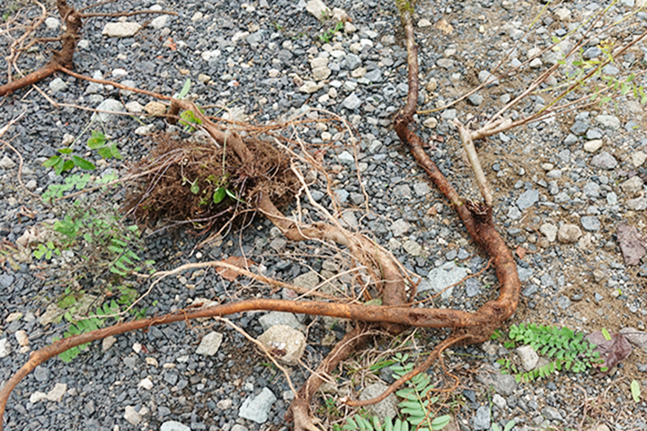 ある程度土を取り除いた後は、イタチハギを引き抜く作業に移ります。根元に近い茎を持って引き抜くのですが、この作業は大人でも力を入れて何度も引っ張らないと抜けないほど、かなりの力が必要です。特に子どもたちは一人ではなかなか抜けず、参加者同士が協力し合い、工夫をしながら、根がちぎれないよう慎重に引き抜いていました。