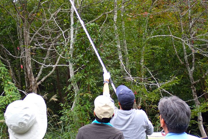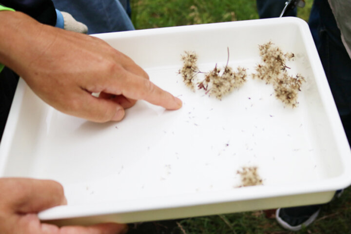 イタチハギを駆除した後の土壌は、一時的に裸地となり、新しい雑草が生えやすい環境になります。そこで、「ブラザーの森 郡上」本来の在来種が根付くことで森林の復元につなげることを目的に、「自然観察コース」では在来種の種子を採取する活動を行いました。